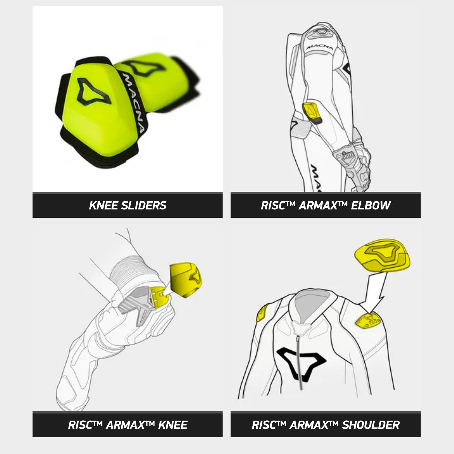 Protection is provided in the form of Armax protectors, which is our latest and safest addition to our Riders’ Impact Safety Concept. Armax consists of a base plate underneath the leather and an abrasion-resistant cover on top. The absence of seams in critical areas greatly increases your safety, as seams are normally the weakest part of a construction.